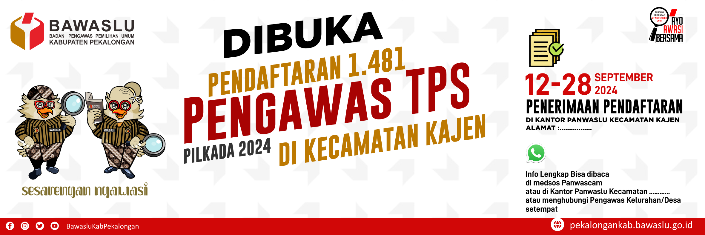 Dalam rangka pembentukan Pengawas TPS untuk Kelurahan/Desa di Kabupaten Pekalongan maka Panwaslu Kecamatan se-Kabupaten Pekalongan membuka kesempatan bagi Warga Negara Indonesia yang memenuhi persyaratan untuk mendaftarkan diri sebagai calon anggota Pengawas TPS.